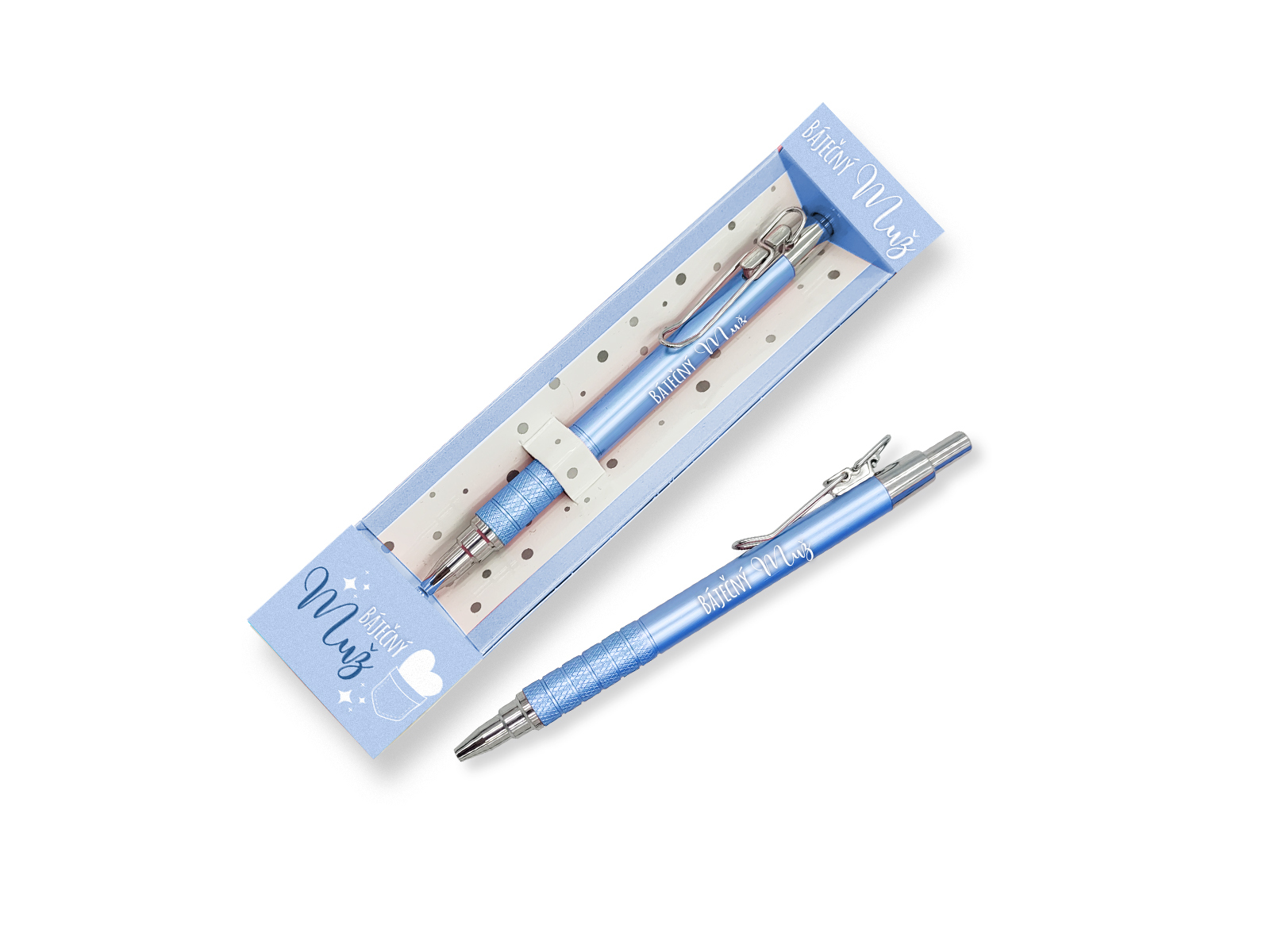 Dárková propiska s věnováním „báječný muž se srdcem na pravém místě“.