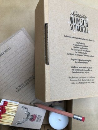 Die Advents Wunsch Schachtel beinhaltet 24 Wunschzettel in einer Box aus A6, die auf der Vorderseite liebevoll und von Hand, mit Weihnachtsmotiven illustriert sind.