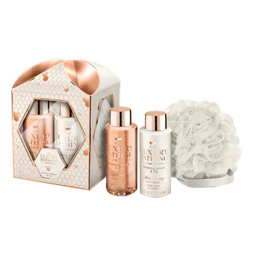 Dámská sada koupelové kosmetiky The Luxury Bathing provoní Vaši pokožku příjemnou vůní a zanechá ji hebkou, hydratovanou a svěží díky výtažkům z vanilky, medu a fíku.Vysoce kvalitní sada The Luxury Bathing obohatí každou koupel a potěší svými účinky i originalitou designu. Ideální dárek anglické značky Grace Cole pro Vás či Vaše přátele nebo na cesty!Set obsahuje osvěžující tělový šampon 100 ml, hydratační tělový krém 100 ml a mycí žíňku.