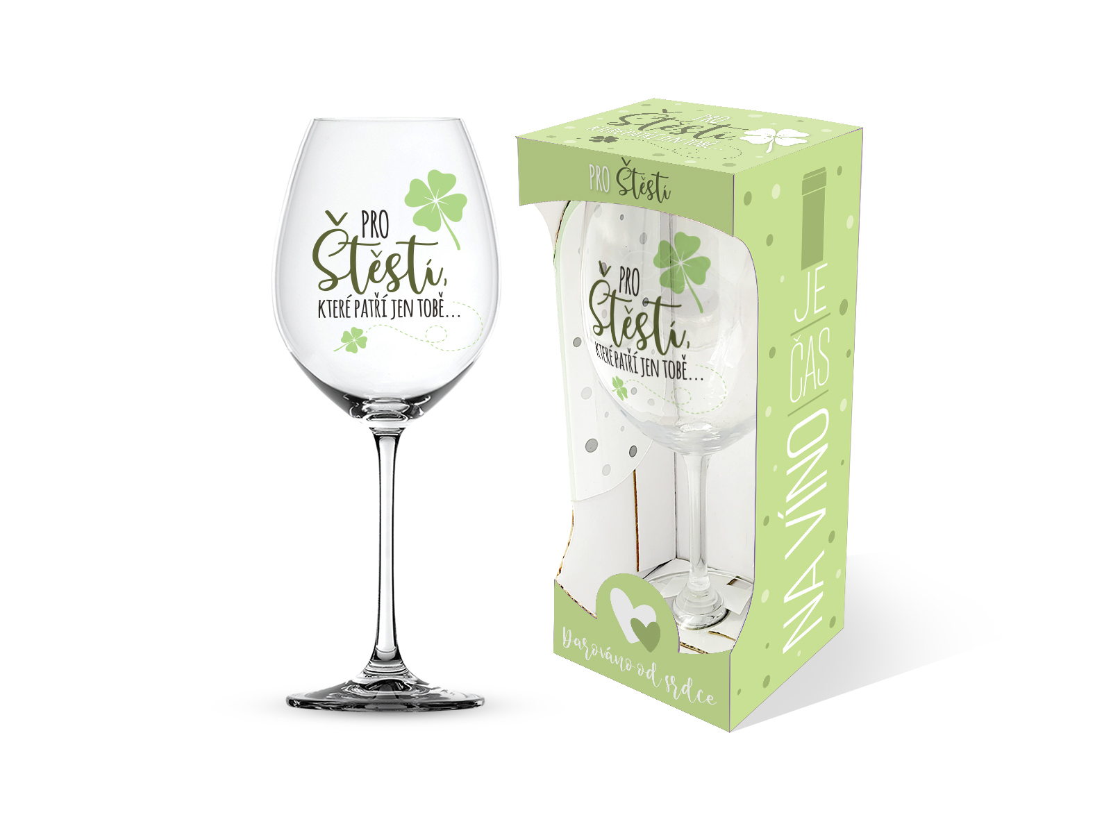 Sklenice na víno s věnováním „pro štěstí, které patří jen tobě“.