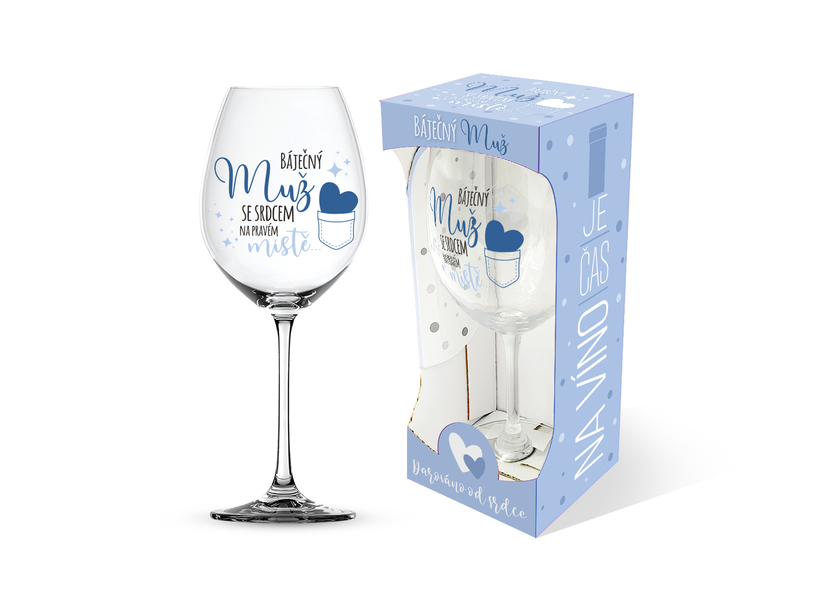Sklenice na víno s věnováním „báječný muž se srdcem na pravém místě“.