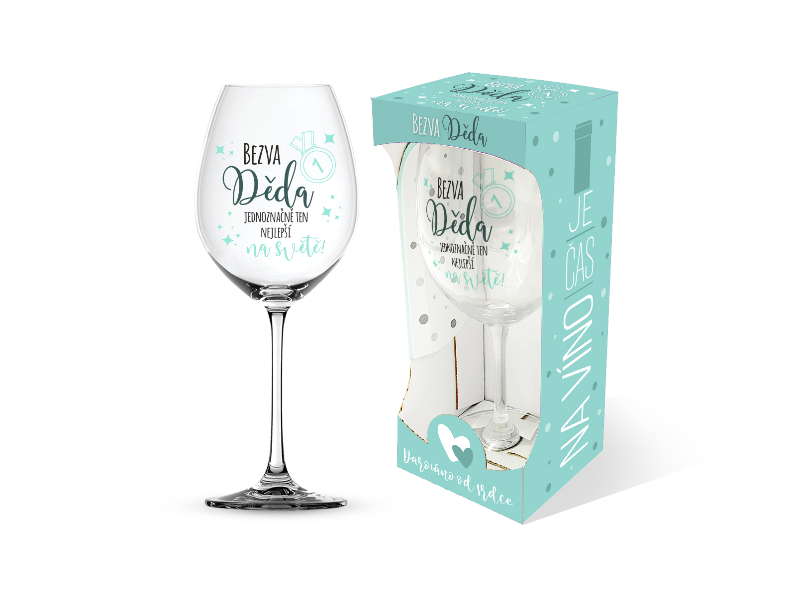 Sklenice na víno s věnováním „bezva děda - jednoznačně ten nejlepší na světě“.