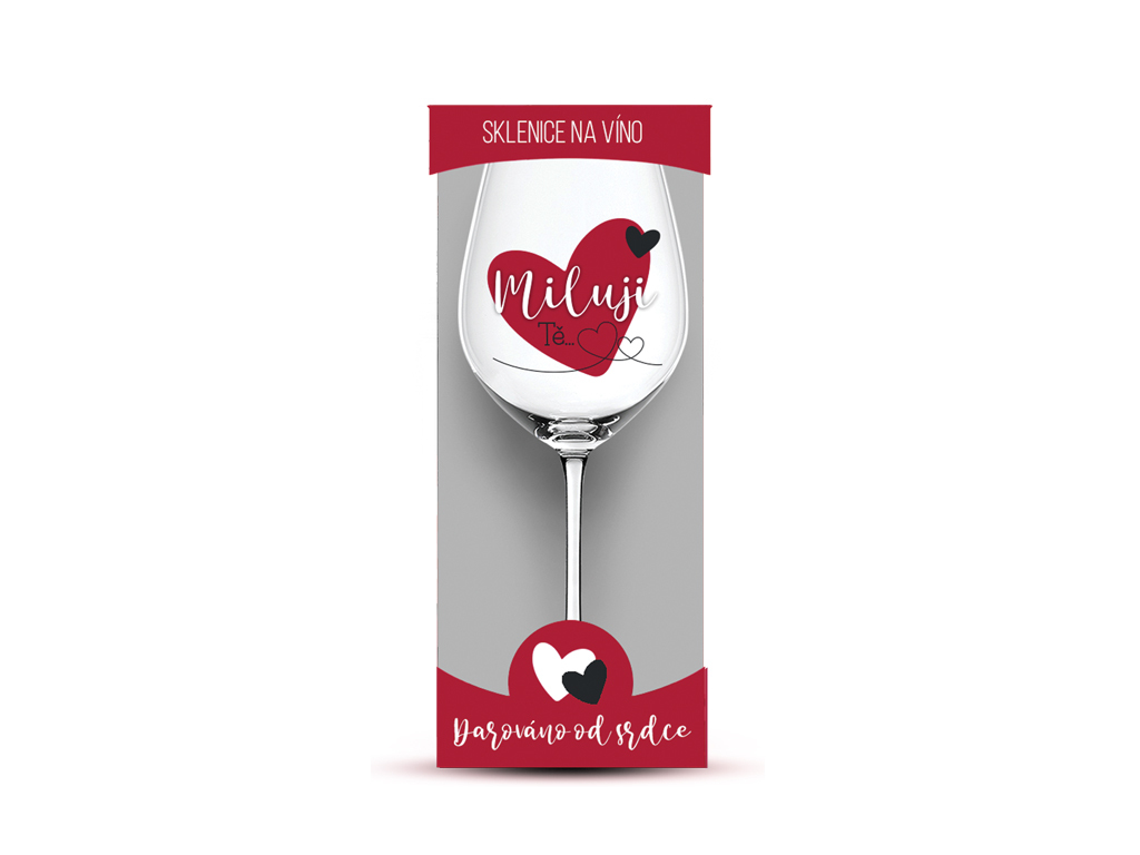 Dárková sklenice na víno s věnováním „Miluji Tě“.