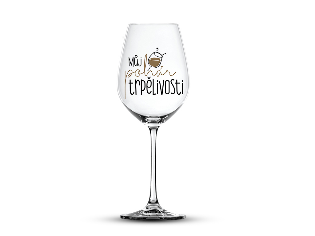 Dobré víno chutná nejlépe ve sklenici s textem „Můj pohár trpělivosti“.