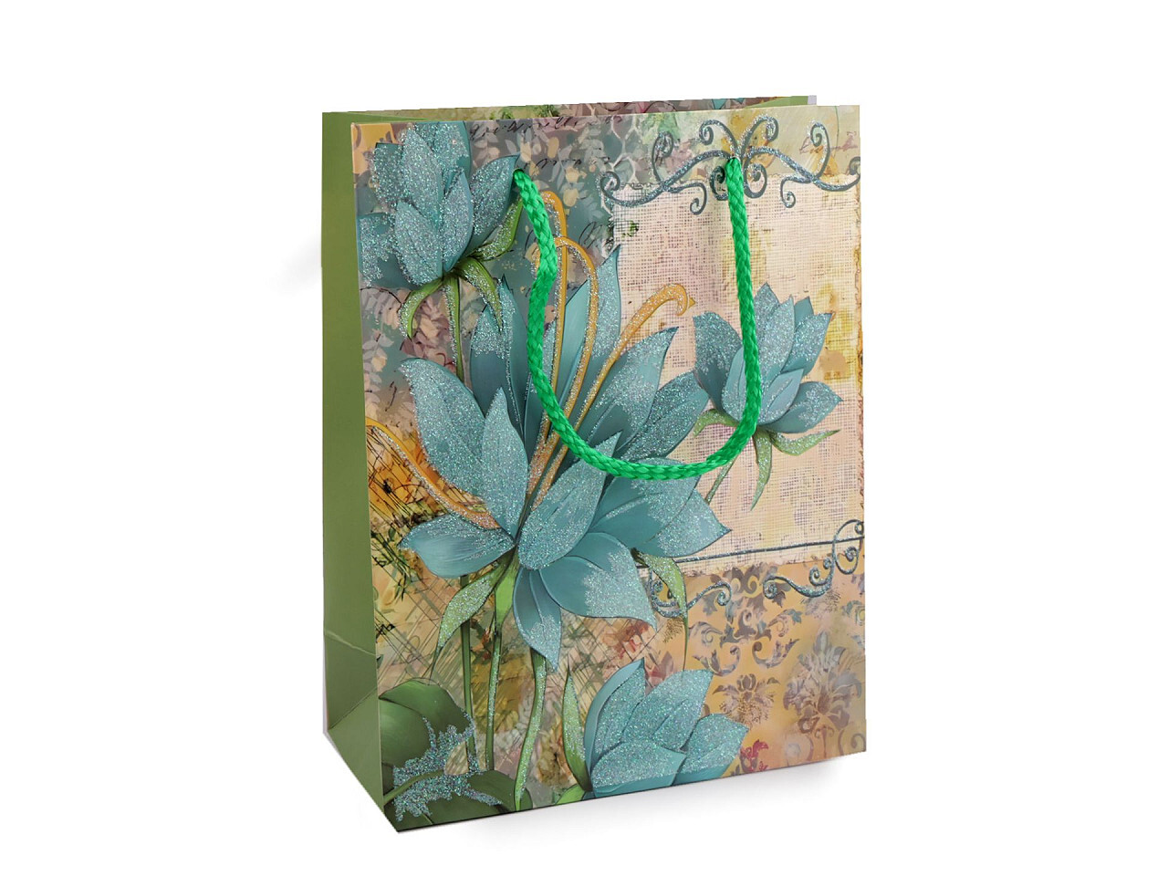 Dárková taška s glitry květy - 12 ks - 3 zelená šalvěj světlá