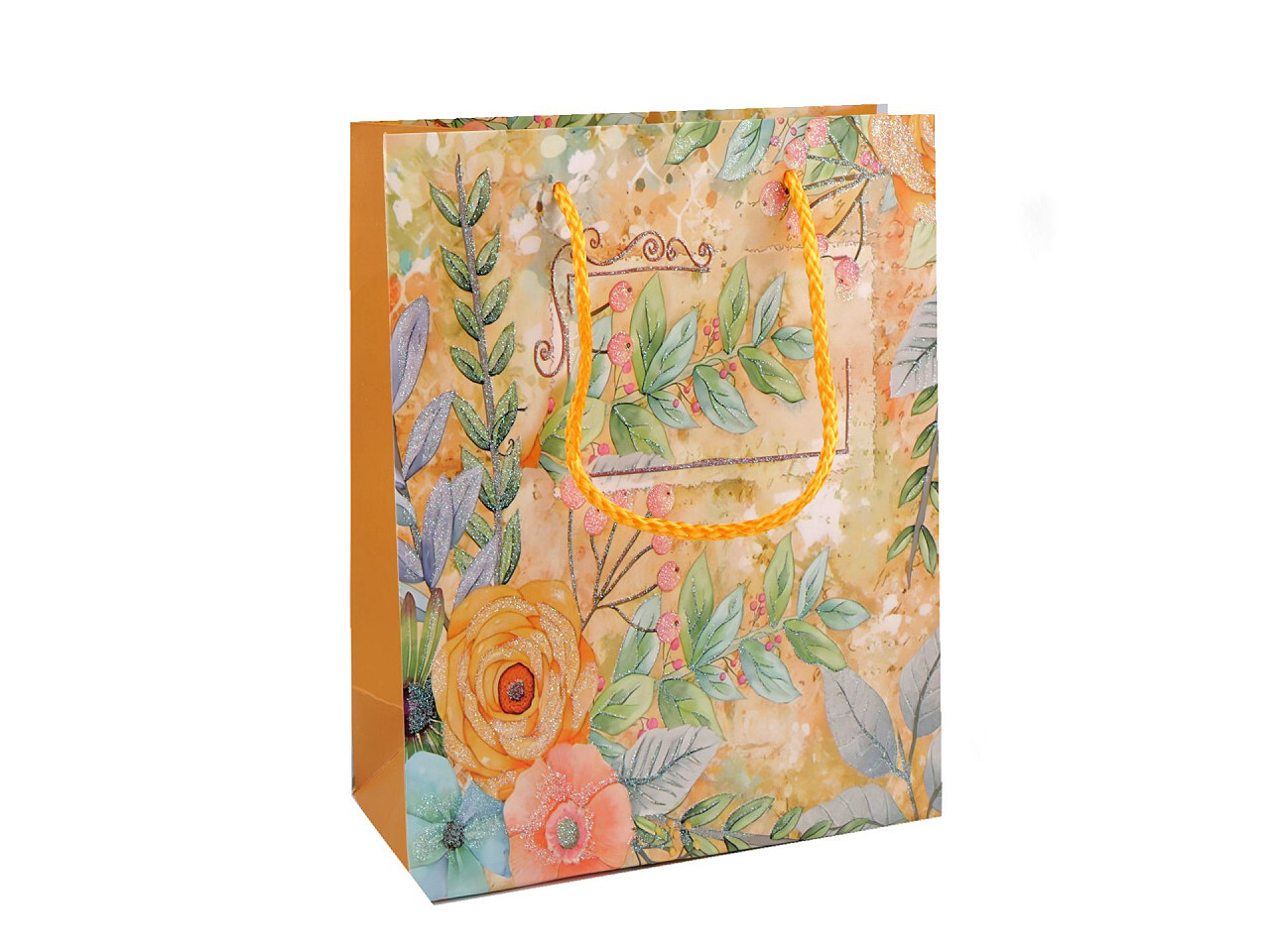 Dárková taška s květinovým motivem je díky glitrů na přední straně velice efektní. Je ideální pro všechny, kteří chtějí rychle zabalit dárek. Je vyrobená z kvalitního křídového papíru, potisk je z obou stran. Ucha tašky jsou ze spletené šňůry.