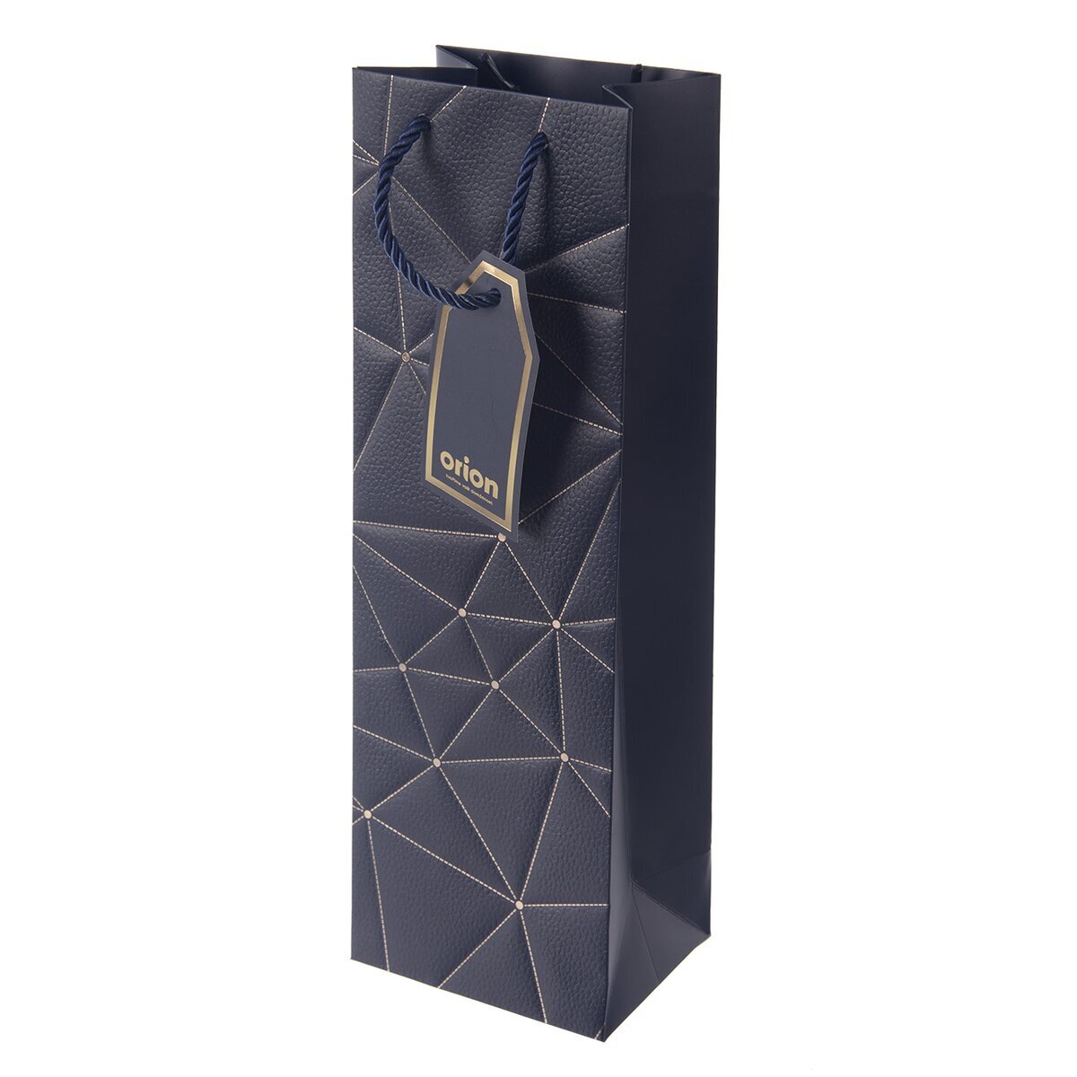 Dárková taška na láhev se dvěma uchy, plastický dekor, na přední straně zdobená zlatými linkami, doplněna jmenovkou. Modrá. Materiál: papír, provázek - polyester. Rozměry: 12x9x36 cm.