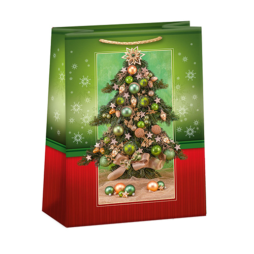 Darčeková taška s vianočným motívom. Na tejto je vyobrazený vianočný stromček s guľami. Povrch je lesklý. Rozmery tašky sú 230 x 320 x 125 mm.