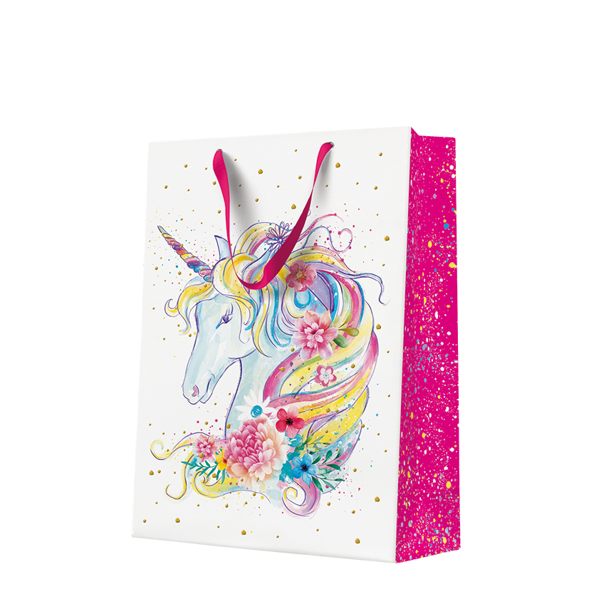 Tato taška je vyrobena z kvalitního papíru, který je pevný a odolný, takže bezpečně unese všechny vaše dárky. Barevný potisk s motivem květin a jednorožce dodá vašemu balení osobitý a veselý vzhled. Díky rozměrům 26,5 x 33 x 13,5 cm nabízí dostatek prostoru pro různé druhy dárků - od knih přes kosmetiku až po módní doplňky. Potěšte své blízké nejen obsahem, ale i efektním balením, které tato taška umožňuje.