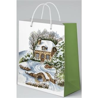 Dárková taška zimní krajina.Rozměry : 31 x 12 cm, výška 42 cm.Barva : kombinace zelená, bílá, hnědá.Materiál : papír. číst celé