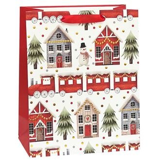 Tato vánoční dárková taška je zdobena roztomilým motivem domečků a vláčku v tradičních vánočních barvách - bílé, červené a zelené. Její rozměry 31 x 12 cm s výškou 42 cm dávají dostatek prostoru pro zabalení i větších dárků, přičemž kompaktní tvar usnadňuje manipulaci a přenášení. Taška je vyrobena z kvalitního papíru, což jí propůjčuje lehkost a zároveň odolnost pro bezpečný transport vašich vánočních překvapení.