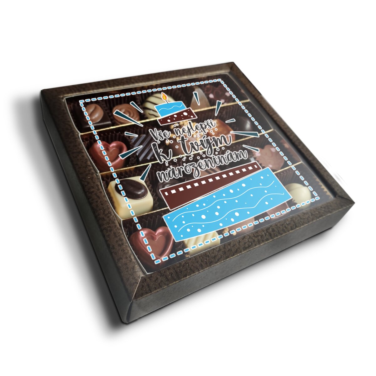 Krabička s pralinkami a lanýži s originálním motivem.Pralinky jsou ideálním dárkem pro milovníky luxusu a požitků. Tento zážitek z mlsání je navýšen o originální potisk, který vystihuje osobní věnování. Pralinky v balení jsou seskládané z mléčné, hořké a bílé čokolády s různými příchutěmi. Pralinky a jsou vyrobeny poctivou českou výrobou z té nejčistší čokolády bez lepku a palmového oleje. Darujte sladkou radost :-)3 varianty: 10, 20 a 28 kusů