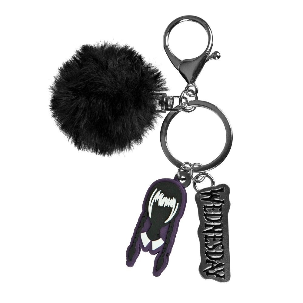 Klíčenka s motivem Wednesday - s chlupatým pompom, 2D gumovým a 2D kovovým přívěskem. Stylový doplněk na klíče, batoh nebo tašku. číst celé