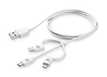 Univerzální kabel Cellularline 3v1 představuje univerzální řešení pro nabíjení i datový přenos pro všechny modely smartphonů a tabletů na trhu. K USB kabelu jsou připojeny dvě redukce, které umožní proměnit základní micro USB konektor na konektor Lightning nebo USB-C. Jeden kabel vám tak umožní připojení jakéhokoliv konektoru.