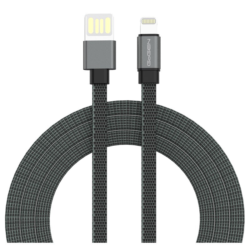 Datový a nabíjecí propojovací kabel Lightning 1 m, oboustranný USB 2.0 A - Lightning vidlice, kovové konektory, ploché provedení, textilní opletení, šedá barva