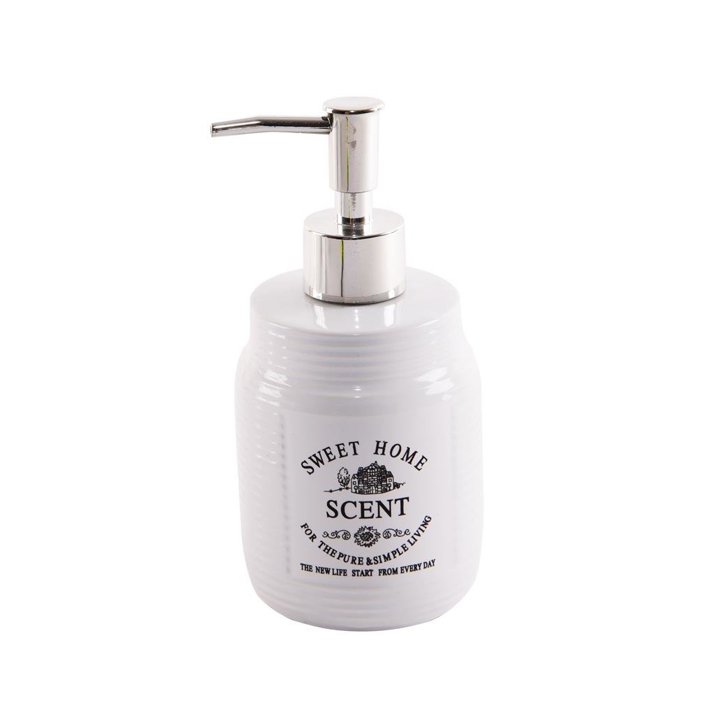 Dávkovač mýdla. Barva bílá, dekor SWEET HOME. Materiál: keramika. Rozměry: objem 0,4 l, pr. 8 cm, v. 16,5 cm. číst celé
