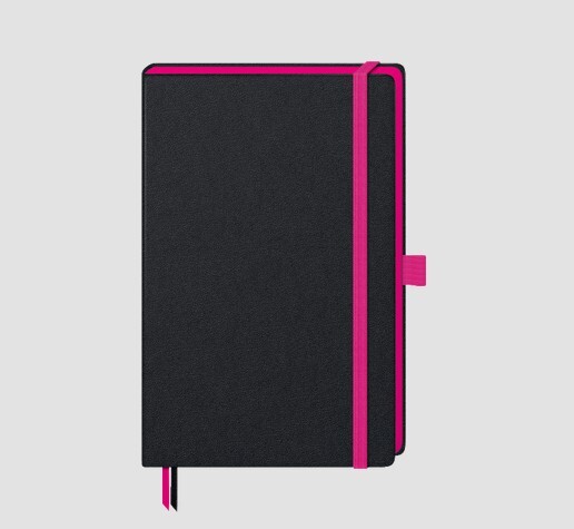 Blok A5 Kompagnon s růžovou gumičkou, čtverečkovaný, ořízka bloku růžová, 176 číslovaných + 16 nečíslovaných stránek, 2 záložky - jedna černá, druhá v barvě gumičky. 80g m2, 96 listů, kvalitní papír, formát 12,5 x 19,5 cm.