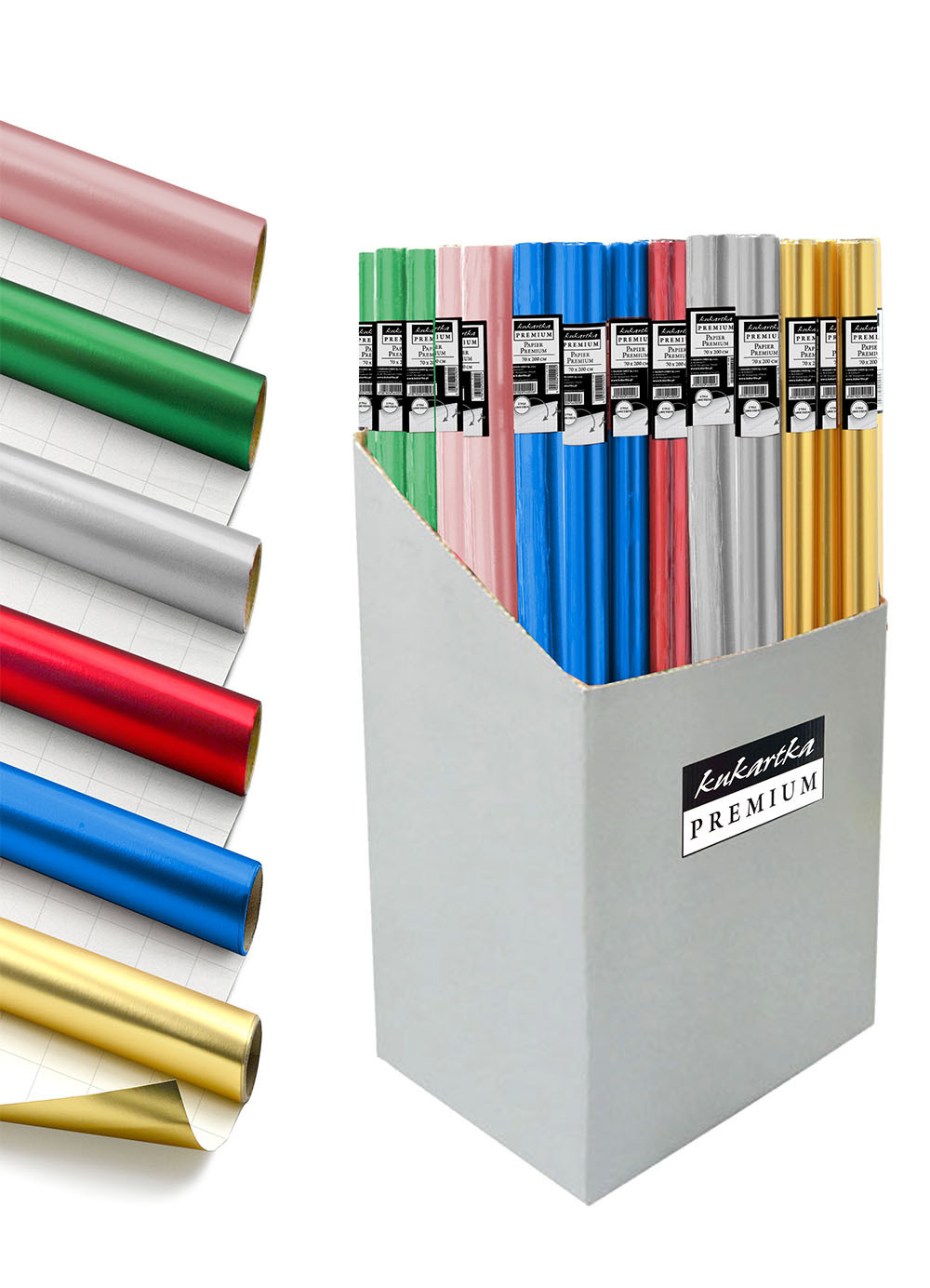 Papier ozdobny premium całoroczny - metaliczny PO-012Papier z metalizowaną folią do pakowania prezentów, z dodatkowymi liniami kratką po wewnętrznej stronie, ułatwiającymi precyzyjne cięcie. Nowością jest obecność linii, które sprawiają, że cięcie papieru staje się jeszcze łatwiejsze i dokładniejsze.