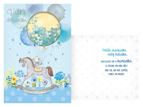 Přání k narození miminka - Narození miminka je veliká událost a je třeba ji oslavit. Pošlete novopečené mamince a tatínkovi blahopřání, které je zajisté potěší, a které jim bude připomínat radostné narození jejich miminka.Text na přední straně přání:Vítej chlapečkuText uvnitř přání:Milá maminko, milý tatínku, gratulujeme Vám k miminku. Co všechno Vám máme přát? Snad jen, aby Vaše zlatíčko, zlobilo jen maličko.Přání je baleno v sáčku, součástí balení je i dopisní obálka. Rozměr: 115mm x 170mm x 2mm (Š x V x H)