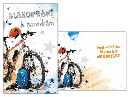 rdečné přání k narozeninám s textem a obrázkem horského kola - Nezapomeňte k dárku k narozeninám koupit i pěkné přáníčko. Uděláte oslavenci určitě velkou radost.Text na přední straně přání:Blahopřání k narozkámText uvnitř přání:Není překážka, kterou bys nezdolal!Přání je baleno v sáčku, součástí balení je i dopisní obálka. Rozměr: 114mm x 190mm x 1mm (Š x V x H)Vyrobeno v EU.
