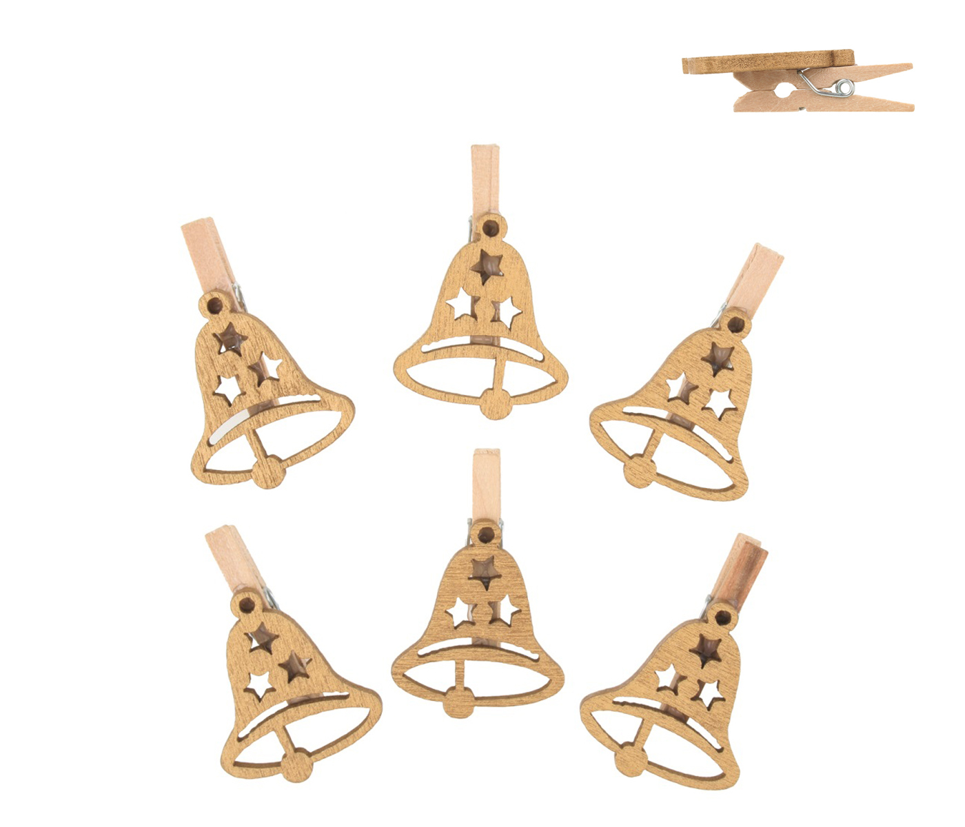 Dekorace vánoční kolíček - Zvonek dřevěný zlatý 3cm, 6 ks 3069