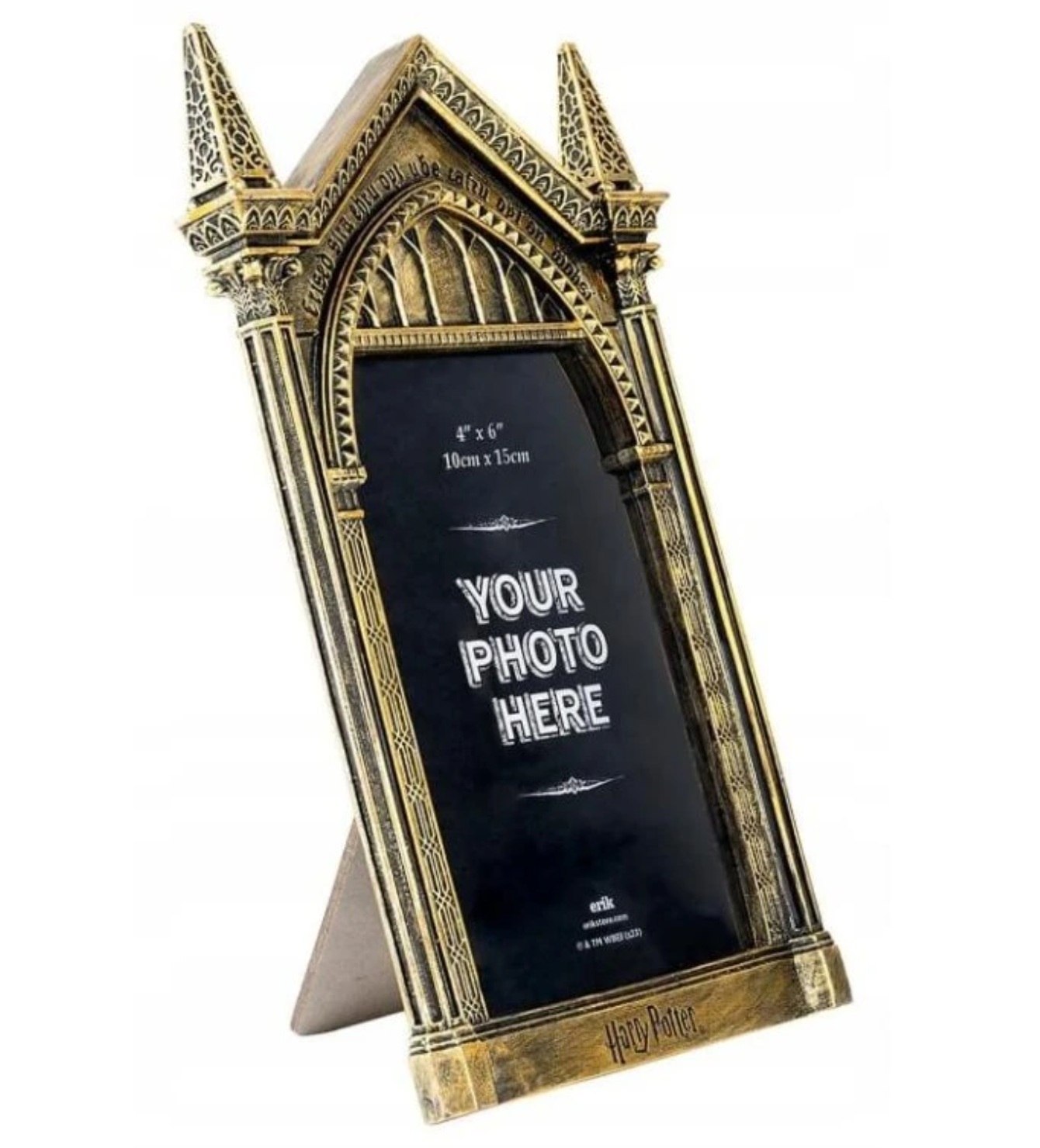 Tento rámeček je určený pro fotografie o velikosti přibližně 15 x 10 cm a věrně zobrazuje atmosféru slavného Zrcadla z Erisedu z Harryho Pottera. Na rámečku najdete i známý záhadný nápis „Erised stra ehru oyt ube cafru oyt on wohsi“, který při přečtení pozpátku odhalí jeho tajemství. Je to nejen krásný dekorativní prvek, ale i skvělý způsob, jak oživit vzpomínky v podobě fotografií a zároveň přidat do vašeho prostoru nádech kouzla a fantazie.
