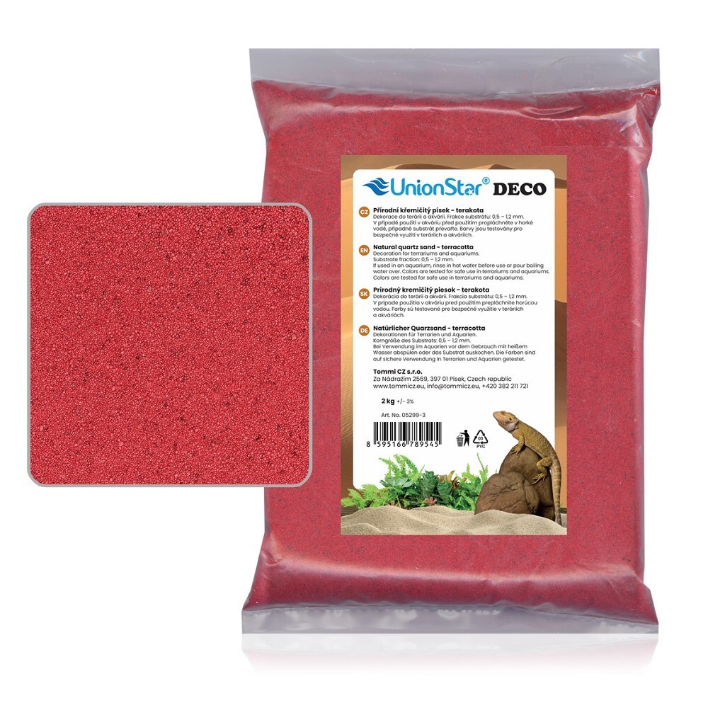 Terarijní písek DECO je vysoce kvalitní přírodní křemičitý substrát s jemnou frakcí 0,5-1,2 mm, dostupný v různých přírodních a atraktivních barevných odstínech. Písek je speciálně barvený testovanými technologiemi, které jsou bezpečné pro použití v teráriích i akváriích - nemění pH vody ani její chemické vlastnosti.