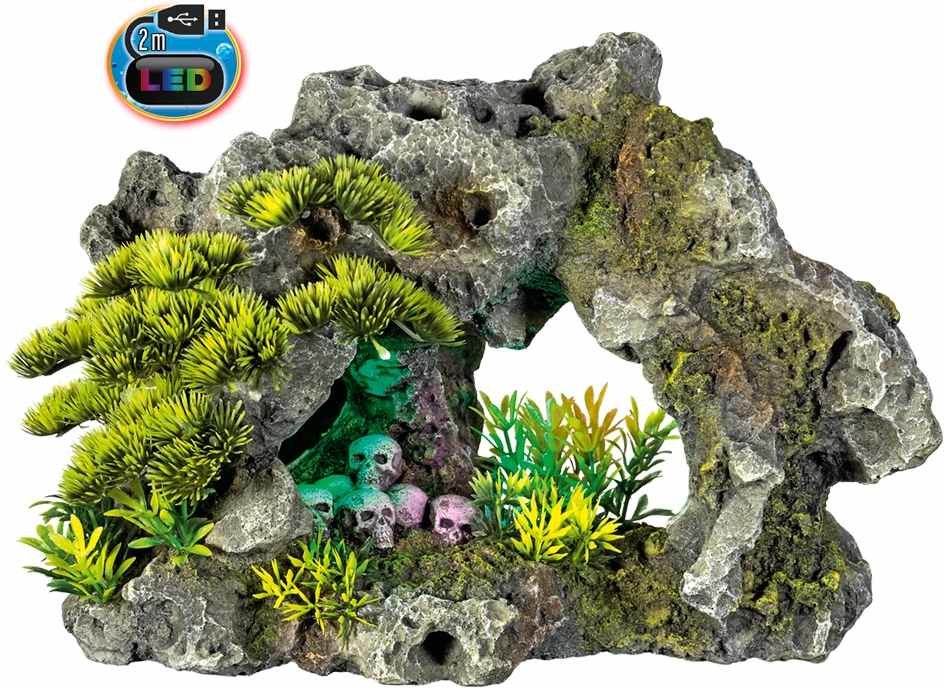Dekorace do akvária značky Nobby. Skála s lebky a s LED osvětlením USB kabel délky 2m. Dekorace s LED diody. Velikost 30,2 x 18,5 x 20,8 cm Vyrobeno z polyresinu (syntetické pryskyřice) Velmi detailní provedení. Netoxické - neutrální na biologické rovnováhy. Vhodné pro sladkou vodu. UPOZORNĚNÍ: Před prvním použitím v akváriu opláchněte vlažnou vodou (bez čisticích prostředků!). Mírné barevné změny jsou možné po delším používání. Výrobek v případě poškození odstraňte z vody. Doporučujeme používat standardní USB nabíjecí zařízení do 1,5A. V žádném případě nepoužívejte tzv. "rychlonabíječky"s 2,4A, mohly by poškodit LED světlo. Dekoraci nepoužívejte v akvariu s mořskou nebo slanou vodou z důvodu citlivosti ryb a korálů na prostředí.