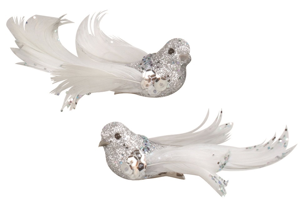 Ptáčci na klipu s glitry stříbrní 8 cm, 2 ks