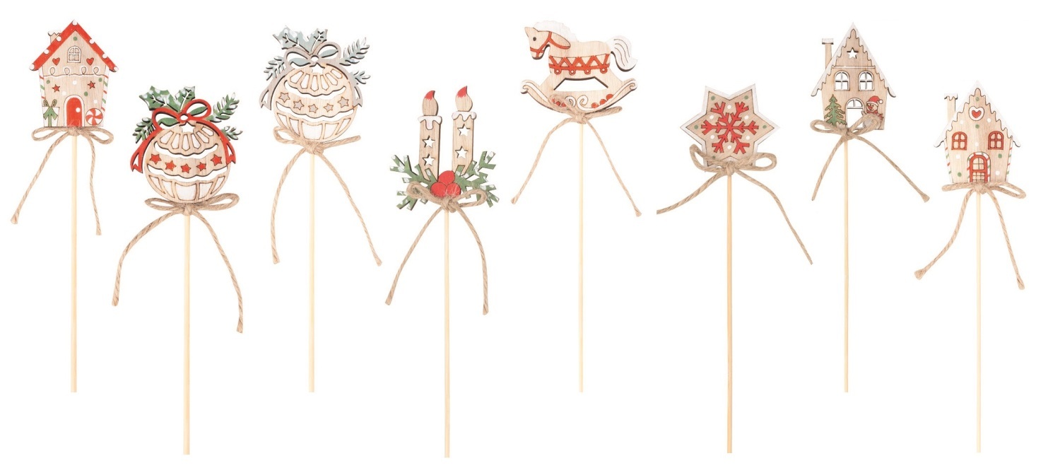 Vánoční zápichy na špejli MIX 8 motivů, dřevěné, 24 ks Tyto dřevěné vánoční zápichy na špejli jsou skvělým a kreativním doplňkem pro vaši vánoční výzdobu. V balení najdete 24 kusů zápichů v 8 různých motivech, které oživí vaše aranžmá. Každý zápich je na špejli, což usnadňuje jejich umístění do květinových aranžmá, vánočních věnců, adventních svícnů nebo přímo na stromeček. Využití: Ideální pro ozdobení vánočního stromečku, adventního věnce, květinových aranžmá nebo pro kreativní tvoření s dětmi. Tyto zápichy dodají vaší výzdobě přírodní, sváteční a veselé kouzlo. Vlastnosti: počet kusů: 24 kssada mix motivůhvězda, baňka, svícen, chaloupka a houpací koníkmateriál: dřevobalení: 24 kusů na špejli v ohrádceDřevěné vánoční zápichy jsou skvělým doplňkem pro každou vánoční výzdobu a přinesou do vašeho domova přírodní a sváteční atmosféru.