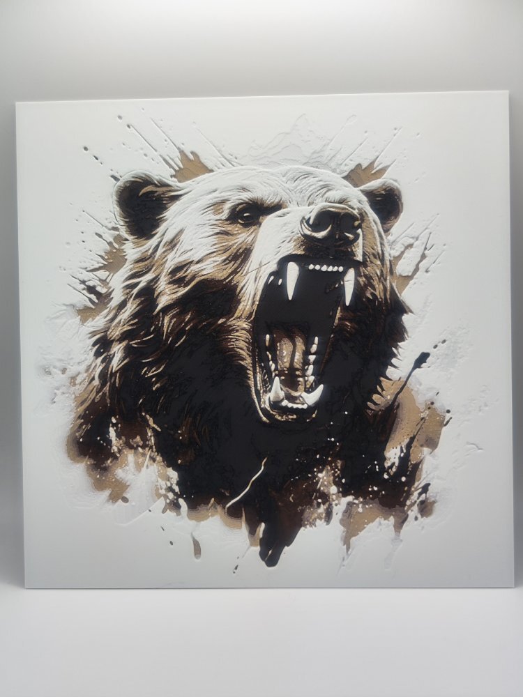 Medvěd s otevřenou tlamou symbolizuje sílu a majestátnost přírody, díky čemuž dodá vašemu prostoru dynamiku a jedinečný charakter.