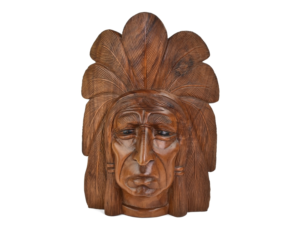 Dřevěná maska indiánského náčelníka. Jedná se o ruční práci thajských řezbařů.Rozměry: Výška: 56 cmŠířka: 40 cmHloubka: 21 cmMateriál: dřevoHmotnost: 5 kg