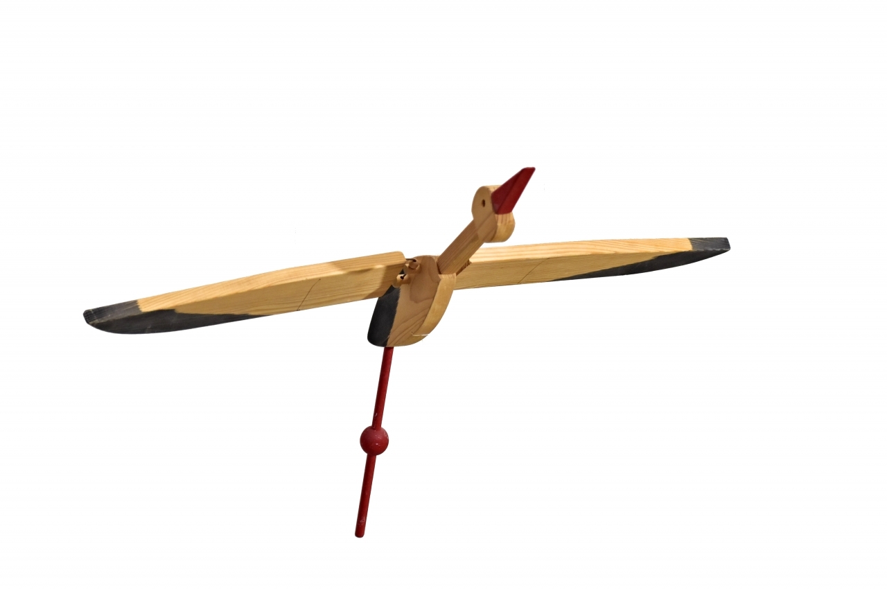 Létající čáp je vyroben z masivního dřeva a po zatahání za šňůrku se houpe a mává křídly.