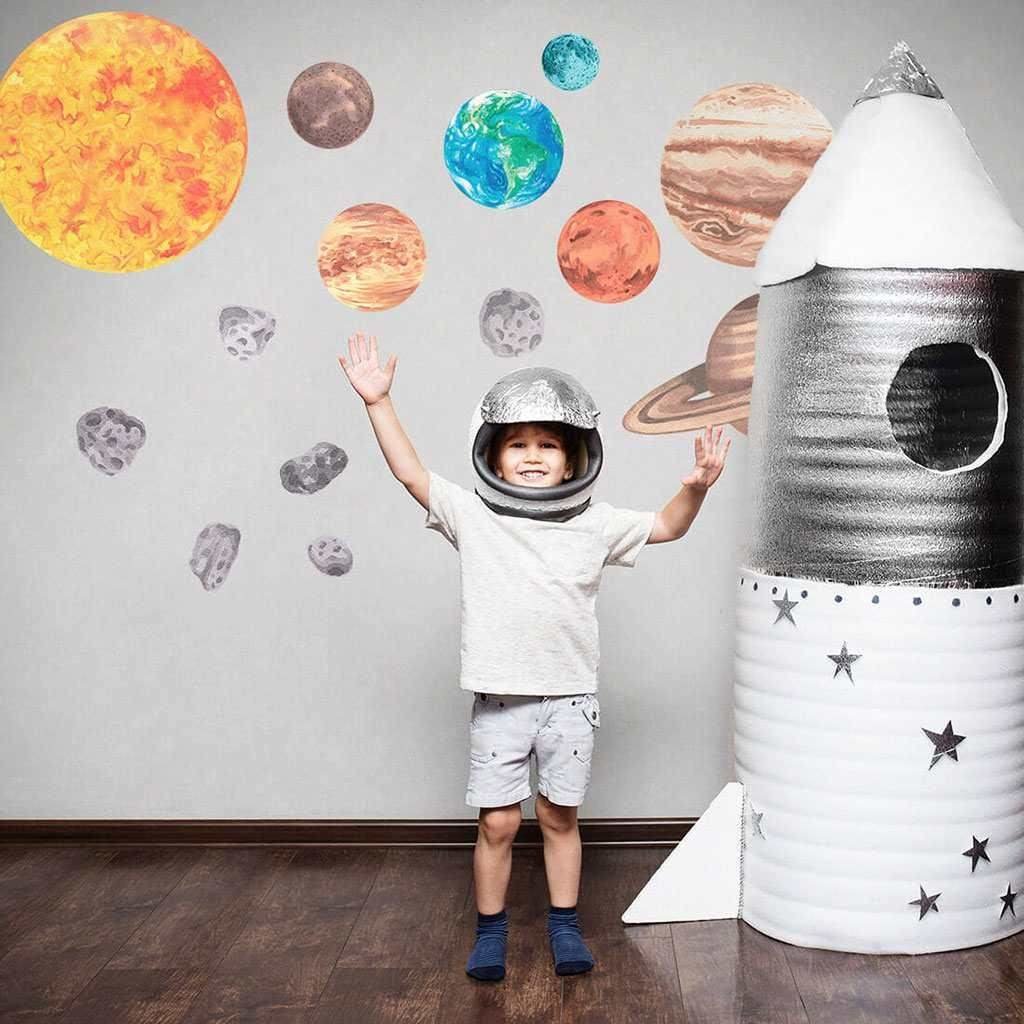 Krásná nálepka na zeď Sluneční soustava L. Samolepky sluneční soustavy jsou skvělým způsobem, jak přidat do dětského pokoje nadpozemský vesmírný motiv. Sada samolepek obsahuje 8 planet: Merkur, Venuše, Země, Mars, Jupiter, Saturn, Uran a Neptun. Sada také obsahuje slunce, měsíc a několik asteroidů.