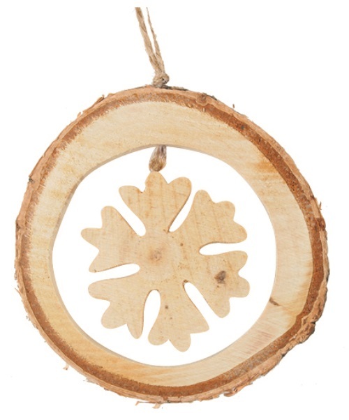 Přírodní dekorace ze dřeva s vločkou se hodí téměř do každého interiéru.