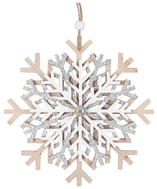 Vločka dřevěná se stříbrnými glitry a kamínkem na zavěšení 15 cm