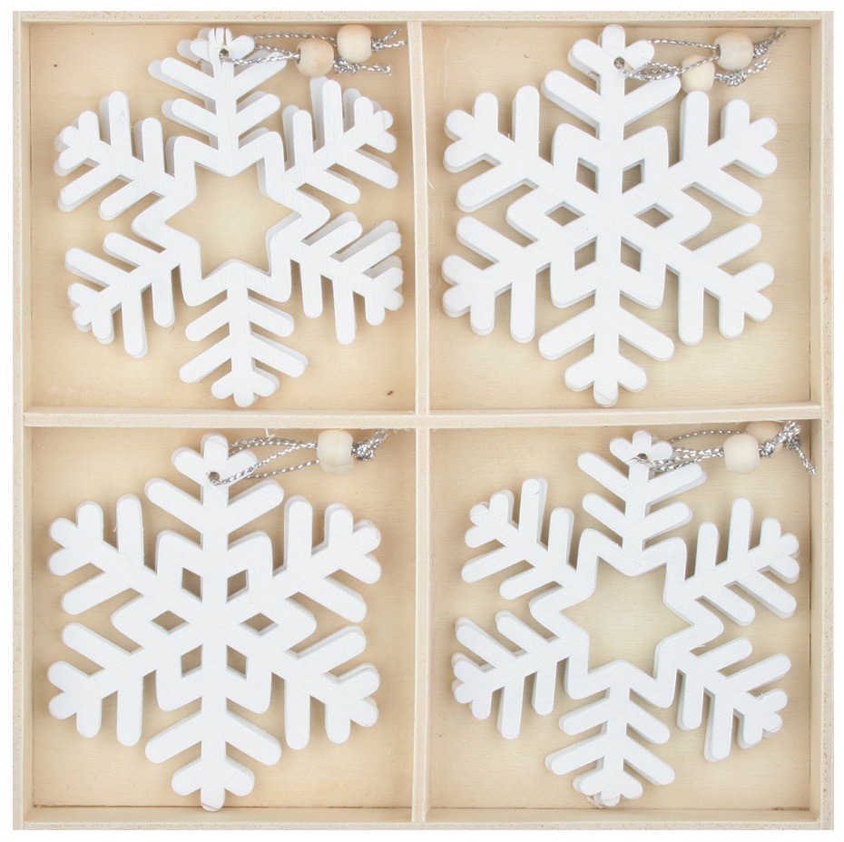 Vločky dřevěné bílé 7,5 cm 12 ks na zavěšení, v dřevěné krabičce