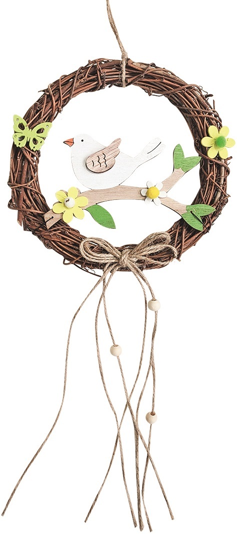 - Materiál: proutí a dekorativní prvky (ptáček)
