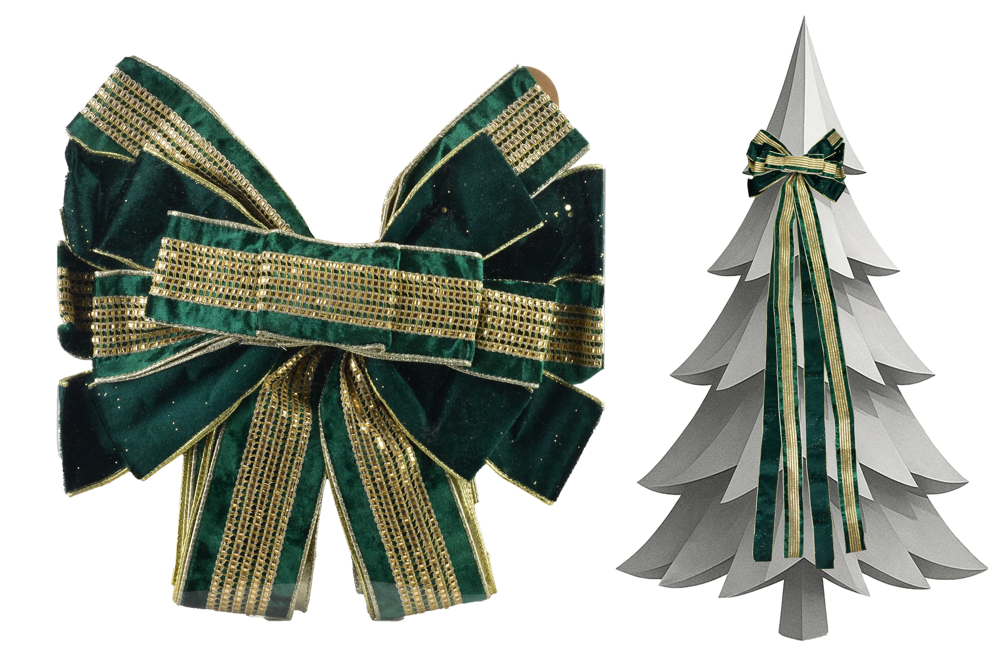 Kokarda SANTA LILA o wymiarach 32x130 cm wykonana z głębokiego, zielonego welwetu ze złotymi akcentami to wyjątkowo elegancka dekoracja, która wnosi do wnętrza świąteczny splendor i klasyczne piękno. Aksamitna faktura materiału nadaje jej miękkości i szlachetności, a złote detale subtelnie odbijają światło, dodając całości luksusowego charakteru. Umieszczona na czubku choinki stanowi efektowne, stylowe wykończenie, doskonale komponując się z ozdobami w odcieniach złota, bieli, czerwieni czy beżu. Wysokiej jakości wykonanie gwarantuje trwałość i estetykę kokardy przez wiele sezonów, czyniąc ją ponadczasowym dodatkiem, który podkreśla magię i uroczysty nastrój Bożego Narodzenia.