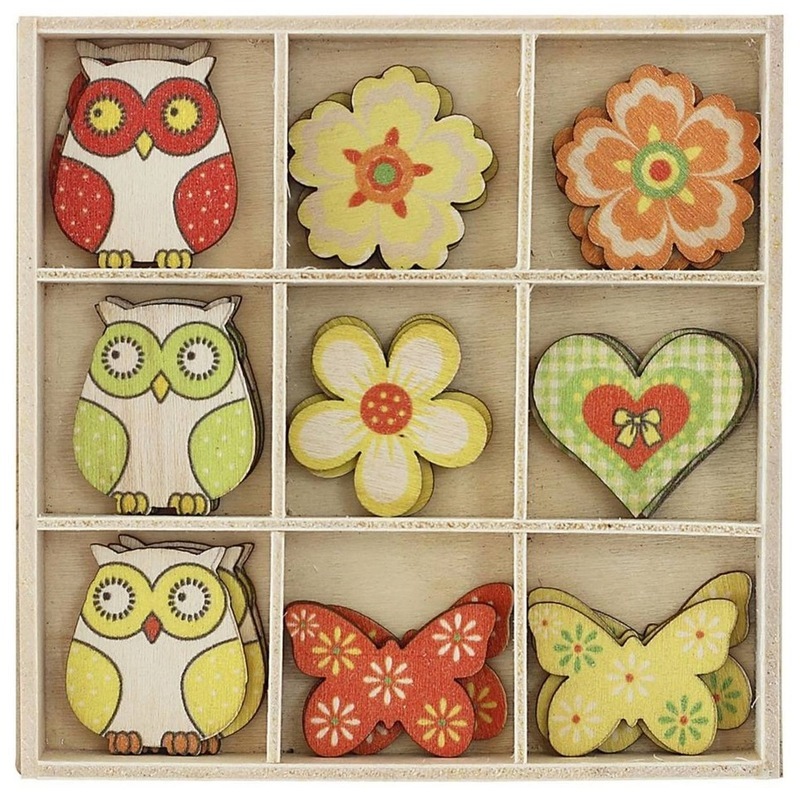 Ozdoby drewniane pudełko Sowy i Kwiaty, op. 27szt., Galeria Papieru