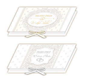 Pudełka na banknoty z kokardką 165 x 85 x 17 mm Prezent z okazji ŚlubuSatynowy lakier wybiórczy, ozdobne tłoczeniaKompozycje i napisy ze złotej folii lub srebrnej foliiW środku wydrukowany tekst życzeńOpakowanie 1 szt.
