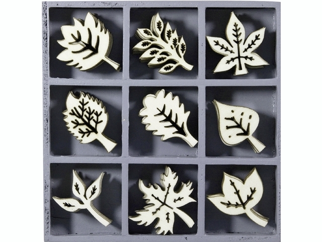 Dřevěné ozdoby v boxu 45ks - listy - 9 motivů po 5 ks, rozměr motivu: 3x3cm.