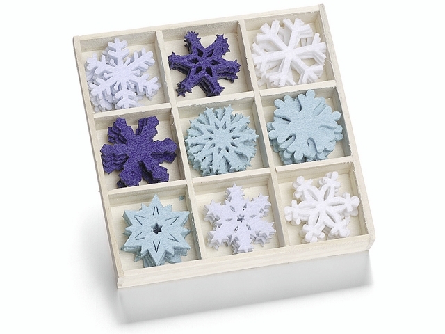 Filcové ozdoby v boxu 45ks - vločky - 9 motivů po 5ks, rozměr motivu: 3x3cm.