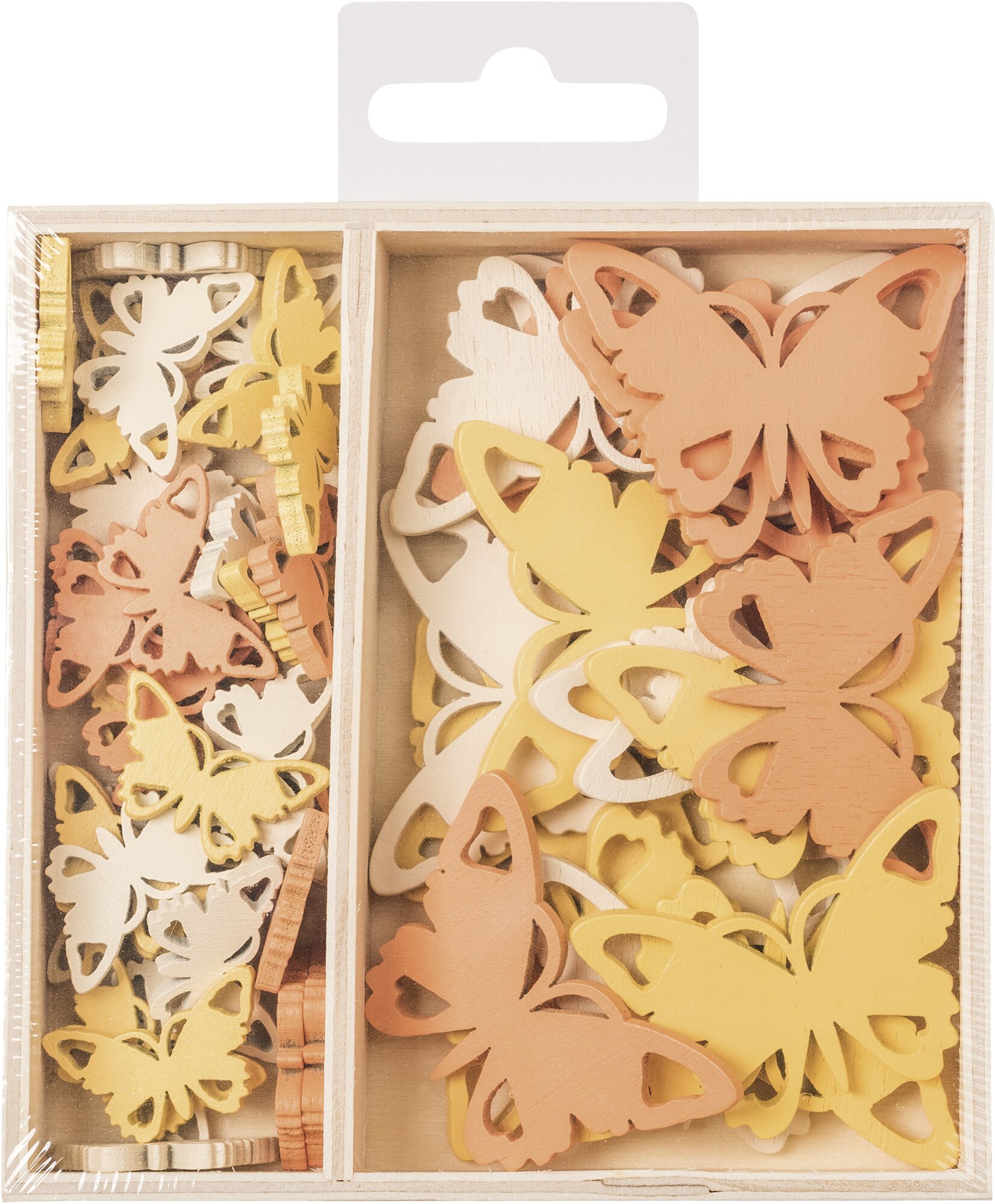 Dřevěné ozdoby v boxu 54ks - motýlci - 2 velikosti, rozměr motivu: 2,5cm, 4,5cm.