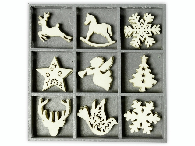 Dřevěné ozdoby v boxu 45ks - vánoce - 9 motivů po 5 ks, rozměr motivu: 3x3cm.