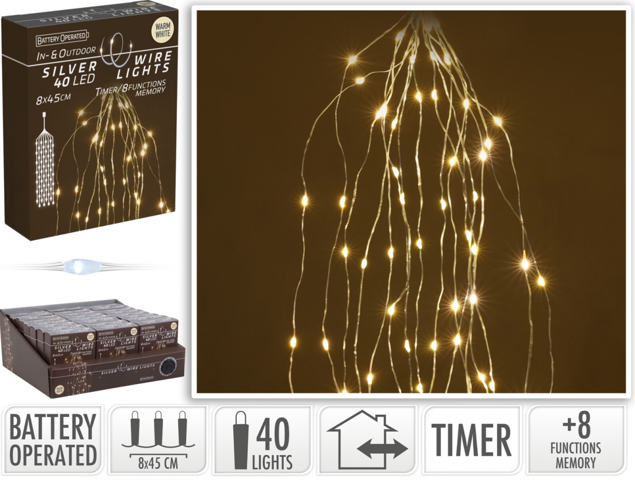 Světelná kaskáda z jemného ohebného stříbrného drátku, který lze téměř libovolně tvarovat. Vhodný k různým příležitostem jako například svatby, oslavy, večírky, plesy, vánoční svátky.