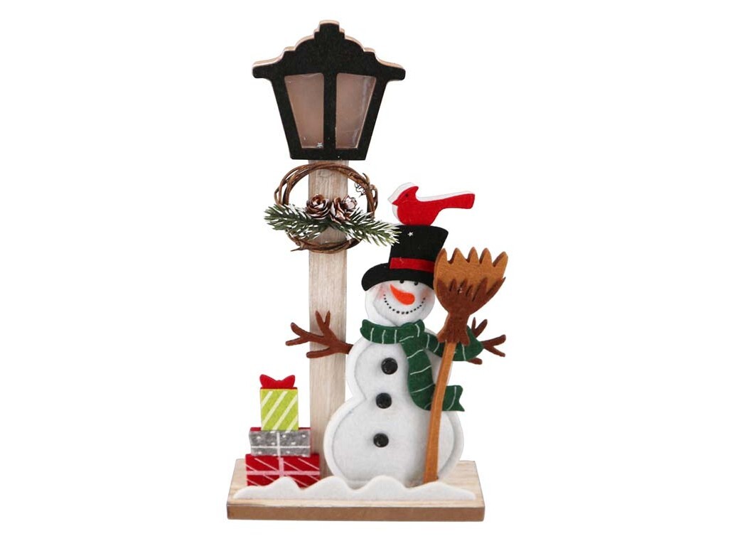 LED dekorace dřevo 145x315mm sněhulák s dárečky u lampy na postavení, barevná