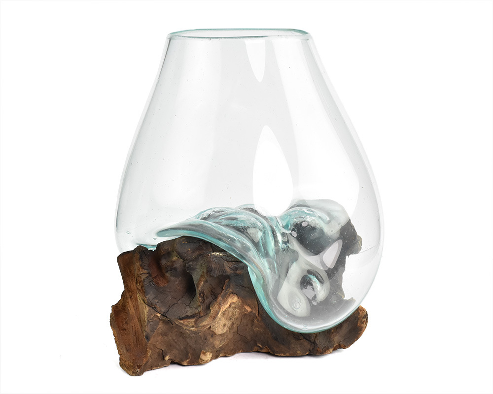 Tato skleněná nádoba spojuje tavené sklo a přírodní dřevo v praktický a estetický doplněk do interiéru. Sklo je ručně tvarované tak, aby přesně zapadlo na dřevěný podklad, což vytváří příjemný kontrast mezi chladným sklem a teplým dřevem. Každý kus je originální díky přirozené struktuře dřeva a jedinečnému tvaru skla.Nádoba dodá prostoru jednoduchý a přírodní prvek, který se hodí do moderních i klasických interiérů.