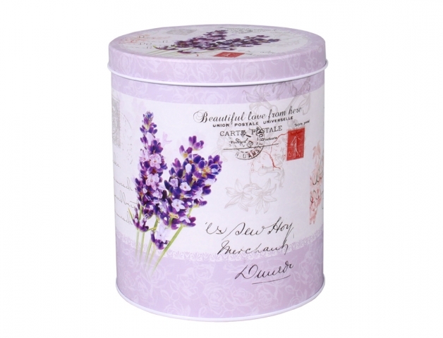 Vysoká plechová dóza s obrázky levandule, známek, razítek a nápisy. Průměr: 14 cm, výška: 16 cm. číst celé