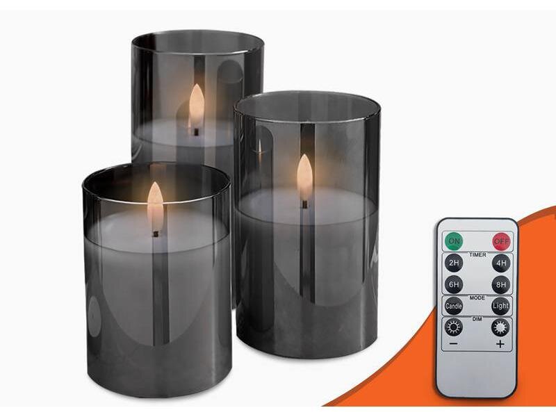 Jedinečné a elegantní dekorativní LED svíčky z kouřového skla jsou perfektním řešením pro každého, kdo chce do svého interiéru vnést trochu kouzla a tepla. Naše sada obsahuje tři svíčky různých výšek a dálkový ovladač, který vám umožní pohodlně a rychle přizpůsobit osvětlení vaší náladě a potřebám.